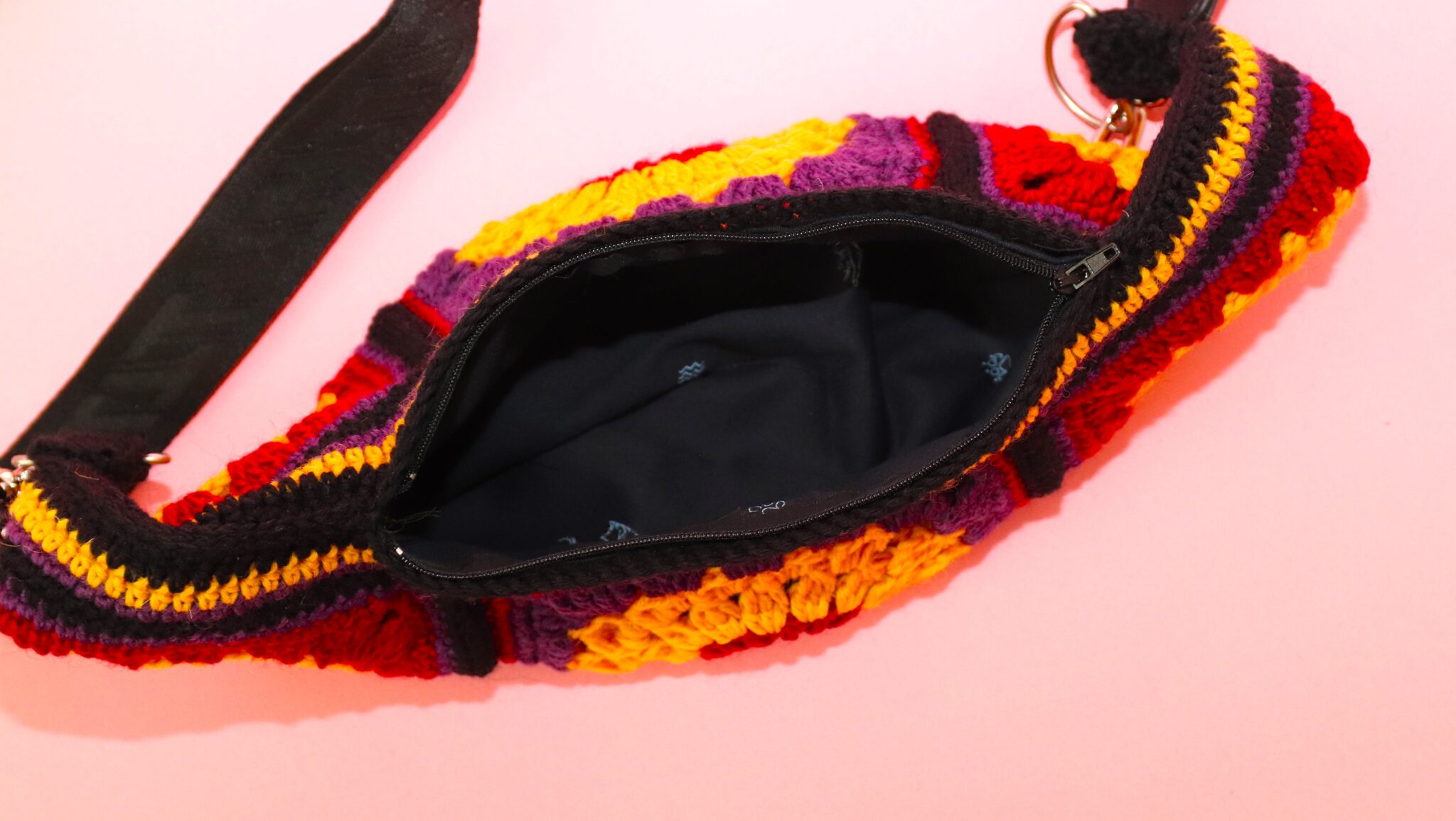 Yhdistä tilkut toisiinsa kuvan mukaisesti piilosilmukoilla työn oikealta puolelta. Molemmille puolille tulee siis 1 tilkku, jota ei taiteta kahtia ja sivuihin 2 taitettua tilkkua. Kun tekele vaikuttaa jo vyölaukulta, virkkaa sen koko suuaukon ympäri ”tasaava kerros” ks:ta, tilkkujen yhdistämiskohtiin 2-3 puolipylvästä, jotta niihin kohtiin ei muodostu ”aukkoja”. 😊