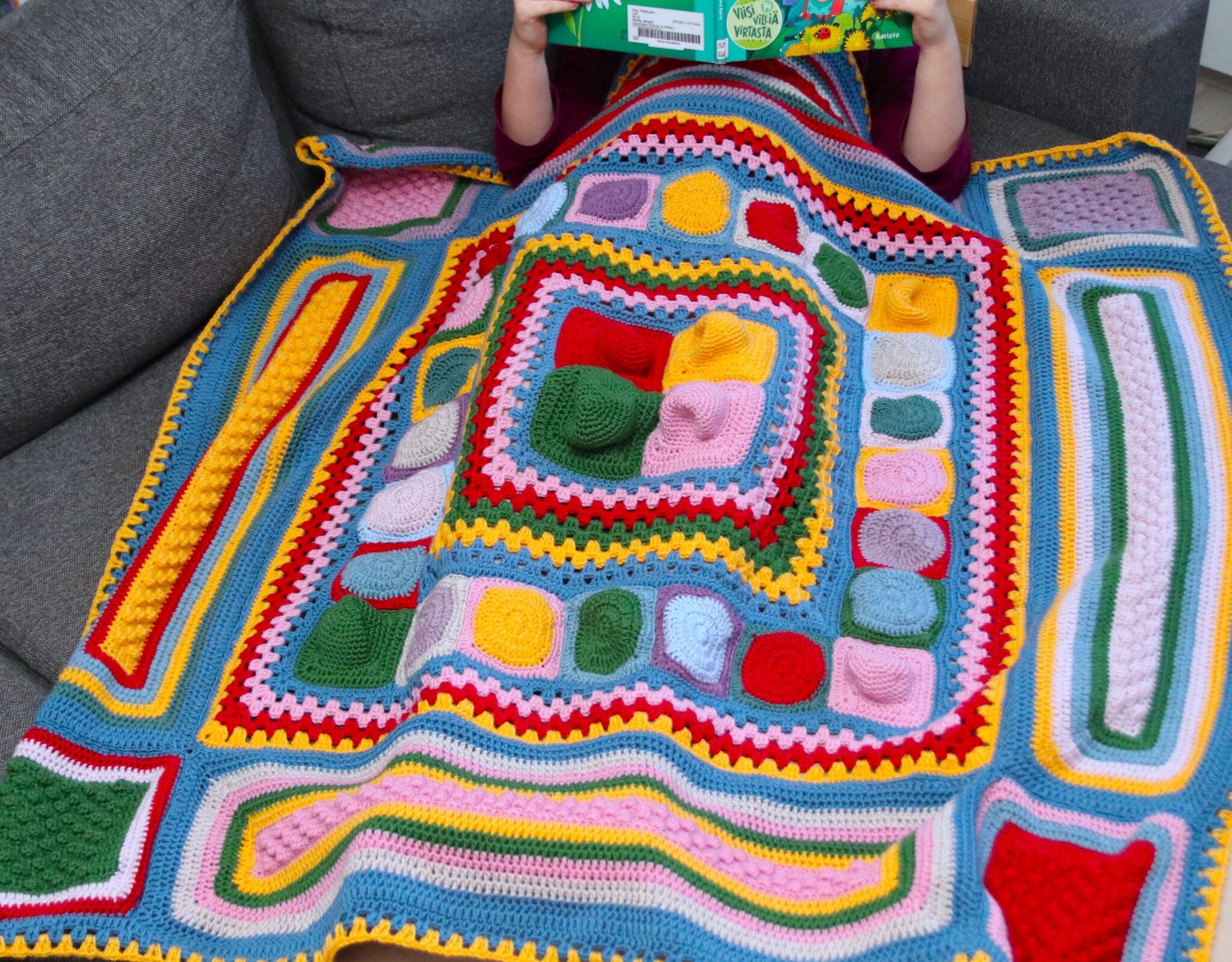 Virkattu ”pop it” hypistelypeitto on idealtaan seuraavanlainen: virkataan peittoon ”pop it” pallukoita, joita sitten taapero- ja alakouluikäiset lapset voivat hypistellä – miksei aikuisetkin. Peitto on värikäs ja pehmeä stressinlievittäjä ja keskittymiskyvyn parantaja. 😊
