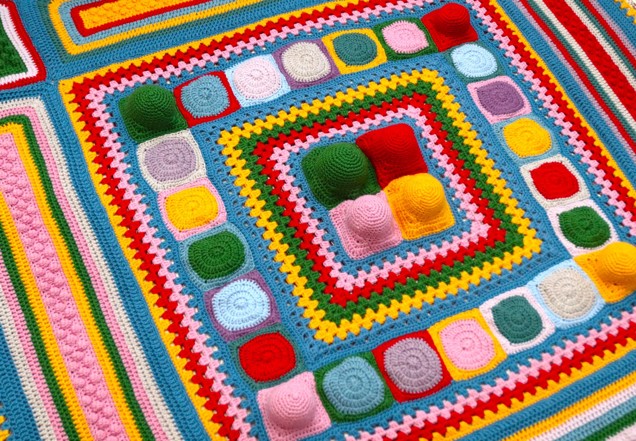 Seuraavaksi peittoa reunustamaan on virkattu isohkoja suorakulmion muotoisia kappaleita, joiden keskellä on 3 virkattua nyppyläsilmukkakerrosta. Saman kerroksen jokaisessa nurkassa on neliön muotoinen nyppylätilkku. Koko peiton ympäri on lopuksi virkattu kerroksia eri väreillä.