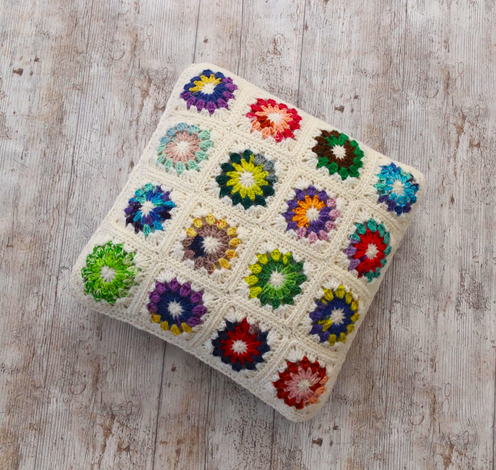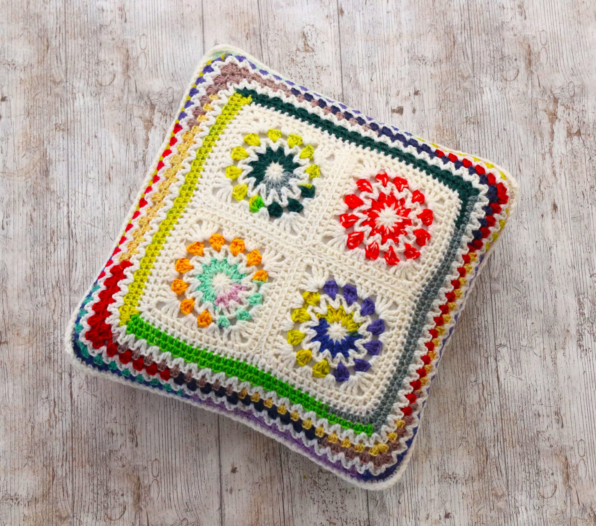 Tyynynpäällinen jämälangoista syntyy kivasti, kun yhdistät värikkääseen kokonaisuuteen jonkin selkeän neutraalin värin, kuten valkoisen tai harmaan. Virkkaa paljon pieniä tilkkuja tai aloita muutamalla tilkulla tyynynpäällisen keskustasta. 😊 Tässä ohjeet saman tyynyn molemmille puolille.